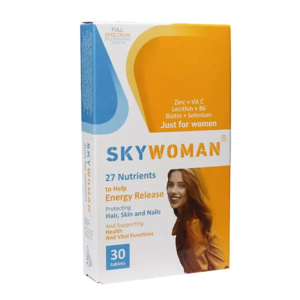 اسکای وومن مولتی ویتامینی تخصصی برای بانوان است که حاوی طیف گسترده‌ای از ویتامین‌ها و املاح به همراه لسیتین، پودر بذر کتان، روغن گل مغربی و روغن گل ستاره‌ای است.