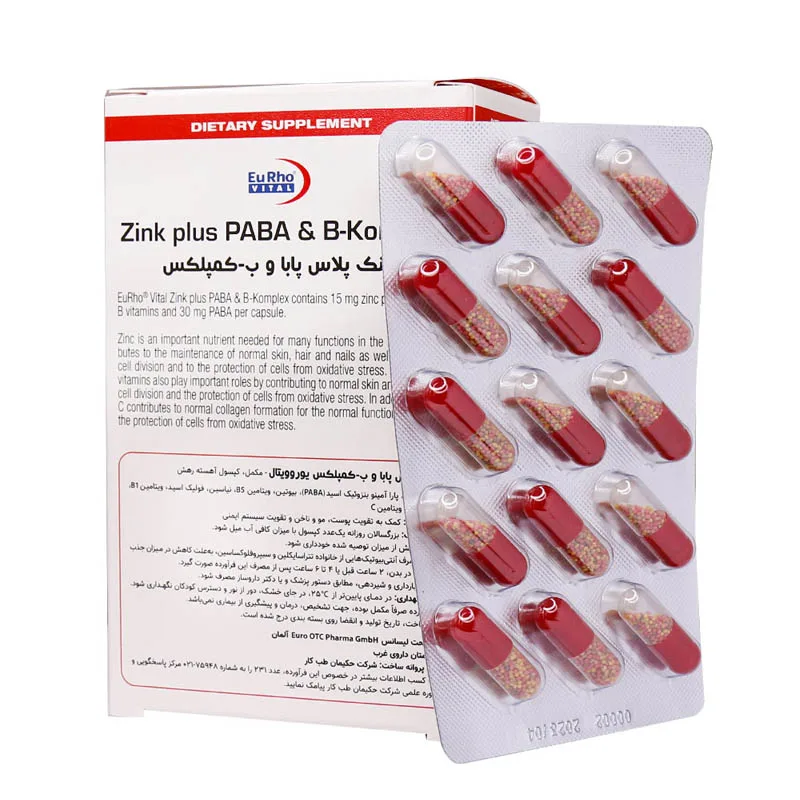 زینک پلاس پابا یوروویتال یک مکمل تخصصی برای تقویت پوست، مو و ناخن است که از ماده معدنی روی، ویتامین C به اضافه پابا و دوز بالای ویتامین های ب کمپلکس تشکیل شده است. ترکیبات موجود در زینک پلاس پابا، برای جلوگیری از ریزش مو، نازک شدن مو و سفید شدن مو مفید هستند. علاوه بر این، با مصرف کپسول زینک پلاس پابا، استحکام بافت ناخن افزایش پیدا می کند، ساخت کلاژن در بافت پوست تحریک می شود و پوست ظاهری شاداب تر و جوان تر پیدا می کند. کپسول زینک پلاس پابا و ب کپلکس یوروویتال به شکل آهسته رهش طراحی شده است.
