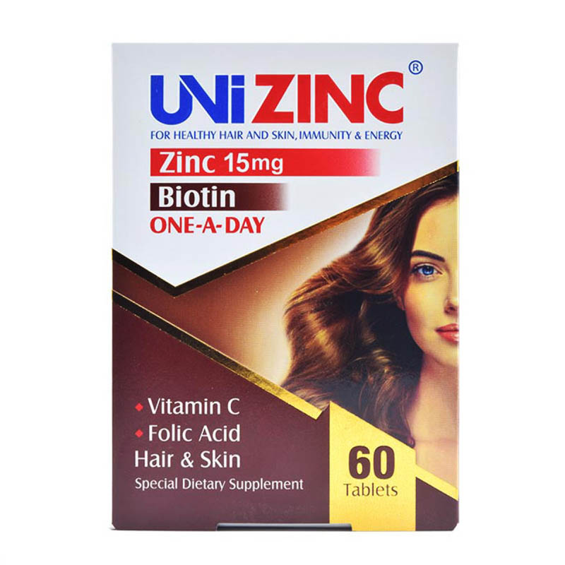 • قرص Uni zinc، مفید در افزایش ضخامت تار مو با دارا بودن ویتامین B5، بیوتین و زینک