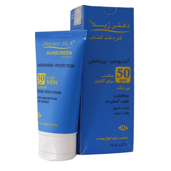 کرم ضد آفتاب بی رنگ SPF ۵۰ آندروسان پروتکشن دکتر ژیلا مناسب آقایان با محافظت گسترده از پرتوهای نور خورشید به ویژه پرتوهای فرابنفش، از پیری پوست ناشی از آفتاب سوختگی پیشگیری میکند. علاوه بر آن توان حفظ رطوبت پوست را افزایش میدهد. این محصول حاوی ویتامین E و C و ترکیبی از ضد آفتابهای آلی و معدنی است. بعد از استفاده اثر سفیدی بر جای نمیگذارد و از این رو مناسب آقایان است. بافت سبک و جذب سریع آن از دیگر ویژگیهای این ضد افتاب است.